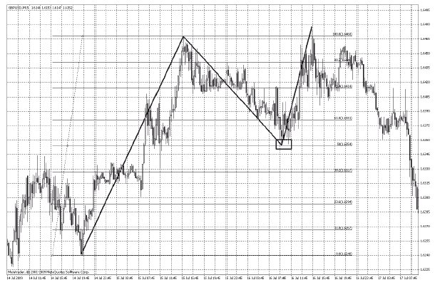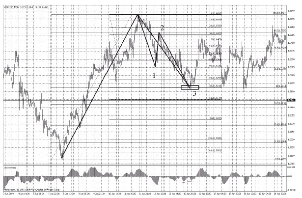 Внимательно посмотрите на рис. 6 и 7. Обратите внимание, как четко с помощью сетки Фибоначчи можно определить окончание импульсной (рис. 6) и коррекционной (рис. 7) волн. Волны отработали по сетке практически пункт в пункт.