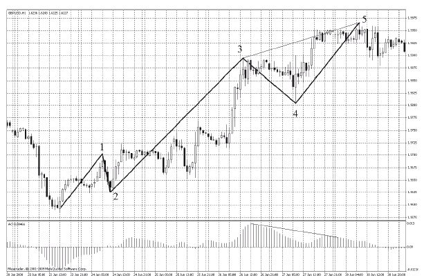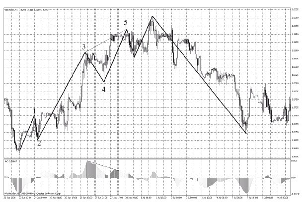 Поэтому главной задачей профессионального трейдера является умение нестандартно мыслить и правильно анализировать рынок. Представьте себе ситуацию: по всему миру в одно и то же время сидят тысячи трейдеров и видят перед собой одну и ту же картину, например на рынке сформировалась классическая пятиволновка с короткой 5-й волной и дивергенцией в конце (рис. 11). Как вы думаете, что будет делать большинство трейдеров, если учесть, что основную часть из них обучают торговать одинаково, используя одни и те же книги классиков торговли? Конечно, большинство встанет на селл и выставит стоп над максимумом, так как рассчитывает на то, что 5-я волна – последняя в бычьем тренде и начнется коррекция. По-моему, это очевидно. По-вашему, как поведет себя рынок в данной ситуации?