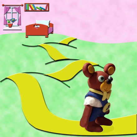 Утро. Яркий лучик солнцаТихо проскочил в оконцеПо углам разлил он светТемнота была – и нетВот проснулся мячикИ разыгравшись скачетМячик прыгнул через лучикПрыг!Лучик прыгнул через мячикСкок!Прыг! Скок! Прыг! Скок!Прыг на стенкуПрыг на столикСо стола на подоконникПрыг! Скок! Прыг! Скок!С подоконника на полкуПрыг! Скок! Прыг! Скок!Повалил проказник книжкиАааааааааааа!И плюхнулся на МишкуСонный медвежонокГлазиками хлопаетКто тут по мне бегает?Кто тут по мне топает?Утром медвежатамОчень сладко спитсяА когда проснешьсяНужно подкрепиться!У моей хозяйкиСегодня День РожденияДумал медвежонокЛопая вареньеПодарю я ей цветочекЯркий и красивыйПодарю и обнимуСильно-сильно-сильноОтправлюсь в путешествиеЗа цветком прекраснымНо вдруг оно окажетсяТрудным и опасным?Чтобы мне преодолетьТрудности в дорогеСъем еще варенья я.И еще немногоМедвежонок ЛютикПо дорожке топаетТоп топТоп топБелая рубашечка,Синие штанишкиНа штанишках пуговкаУкрашает МишкуТоп топТоп топУ него на шее бантикУ него в кармашке фантикТоп топТоп топТопал Мишка час иль дваИ оказался у столаПомнит он что в этом местеВидел он цветок чудесныйКак бы мне,Как бы мнеОказаться на столе?Нужно мне наверх поднятьсяПомогите-ка мне братцыПролетала мимо мухаУхватилася за ухоПоднимала она мишку,Но тяжелый мишка слишкомВот бумажный самолетСмастерил честной народМишка только лапкой всталСамолетик в блинчик смялПрибежал тут тараканПритащил подъемный кранЗацепил крюком штанишкиИ наверх подняли мишкуМедвежонок влез на столЗа цветочком я пришелИ куда нужно идтиЧтобы мне его найти?Вмиг вокруг народ собралсяСразу заинтересовалсяВсе советуют, галдятЗнать не знаютНо кричатОт линейки есть вопрос:А каков цветочка рост?Сделать дыркуВ дырку ниткуПредлагает дыроколКнопка кубарем вертеласьОчень ей помочь хотелосьСкрепки две наперебойСпорили между собойВыгибались, выпрямлялисьТак прямыми и осталисьКарандаш вокруг плясалТолько стол изрисовалЛастикПросветленья радиСтер все записи в тетрадиМедвежонок чешет носСложный видимо вопросПохоже, что цветок не зналЧто я прийдуИ убежал.Вдруг из-под листков бумагиПоказались чьи-то ноги —Вылез заспанный блокнотС обложкой задом напередВсе растрепаны страницыВесь взъерошенСловно птицаКто же мне мешает спать?Рано мне еще вставатьТех, кто больше всех резвитсяЯ впишу в свои страницыТут народ как испугалсяВо все стороны помчалсяУлетел,Ускакал,РазбежалсяИ один медвежонок осталсяРассказал медвежонок рассказПро цветочек что радует глазПро свой путьИ про то как искал.И ни капельки он не привралСогласился Блокнот помочьСделать доброе дело не прочьПролистал он себя впередПролистал он себя назадОн листал,Он сопел,Весь взмок.Но нет записей в нем про цветокЗагрустил МишуткаВытер слезку лапкойНикому не справитьсяС этою загадкойКак же яКак же яХныкХныкБез цветкаБез цветкаХныкХныкКак же бытьКак же бытьХныкХныкЧто же девочке дарить?ХныкХныкСлышит Лютик сильный шумБум! Бум! Бум! Бум!Что за всадник?Кто там скачет?Это скачет белый ящикА за ним бежит вдогонкуБледнолицая девчонкаЛук и стрелы за спинойИ перо над головойИх мышонок догоняетЕле-еле поспеваетМаленький, серенькийС длинненьким носикомОн бежит подпрыгиваяИ махая хвостикомПи пи пиПи пи пиМишка бросился бежатьОт индейцев удиратьНо тут с присоскою стрелаМедвежонка догналаИ поп