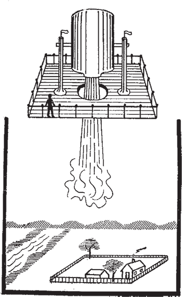 Тем не менее реактивные двигательные установки продолжали изобретать. Так, на одной старинной карикатуре изображен длинноногий джентльмен, который несется в небе верхом на снаряде, из которого извергается реактивная струя. Так высмеивали англичане Чарльза Голяйтли, который еще в 1841 году получил патент на машину, приводимую в движение реактивным паровым двигателем.