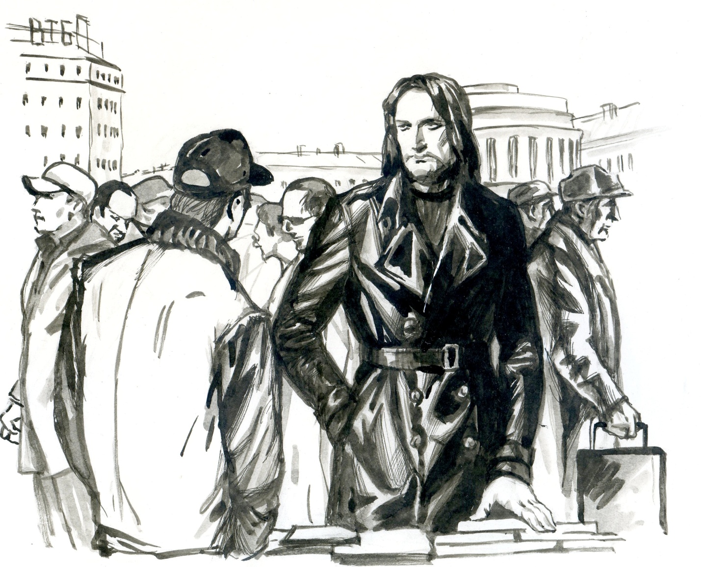 К нему подходит Киллер по кличке Сатана – высокий мужчина с длинными рыжими волосами, одетый в длинный кожаный плащ, на ногах остроносые туфли из крокодиловой кожи. Киллер, хитро улыбаясь, берёт книгу и спрашивает: Что присоветуете господин Вайфай?