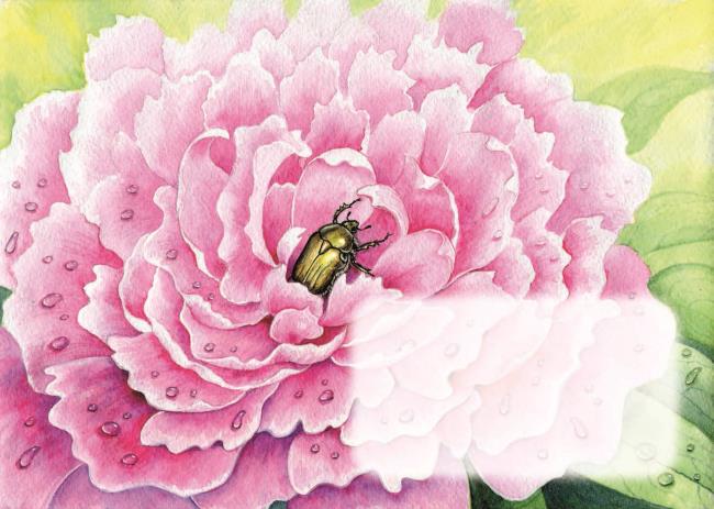 Танечка нагнулась над большим розовым пионом, чтобы понюхать его запах, и увидела золотого жука. То есть он не из чистого золота, не металлический, а живой, но весь сияет, как золотой кусочек.