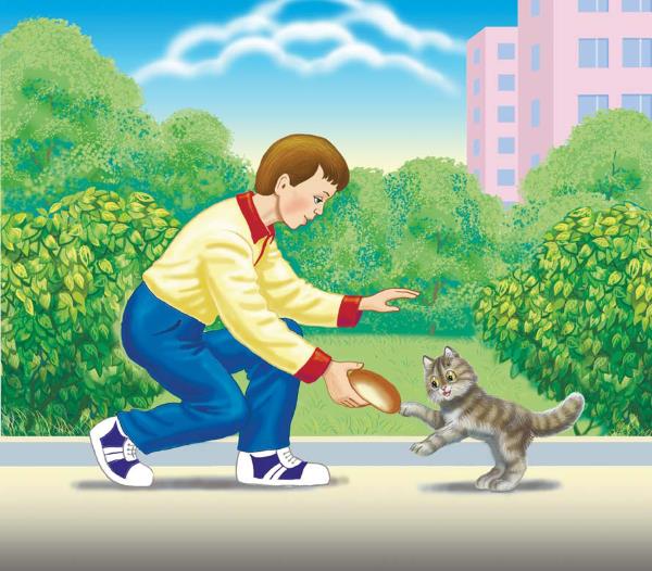 Тут подбегает к нему серый кот, голодный, и мяукает, чтоб его пожалели.