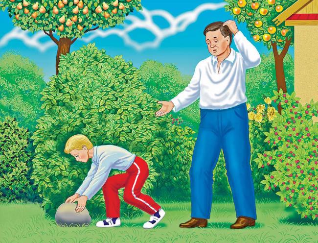 Как-то ему понадобилось опять идти по той дорожке. И только он чуть было не споткнулся о лежачий камень, как его сын, который возвращался из школы, всё увидел, скорей подбежал, да и откатил камень с дорожки, и отец не споткнулся.
