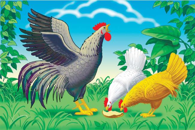 Все трое бросились к хлебу, а радужный петух скорее всех. Своих кур растолкал и хлеб быстро съел.