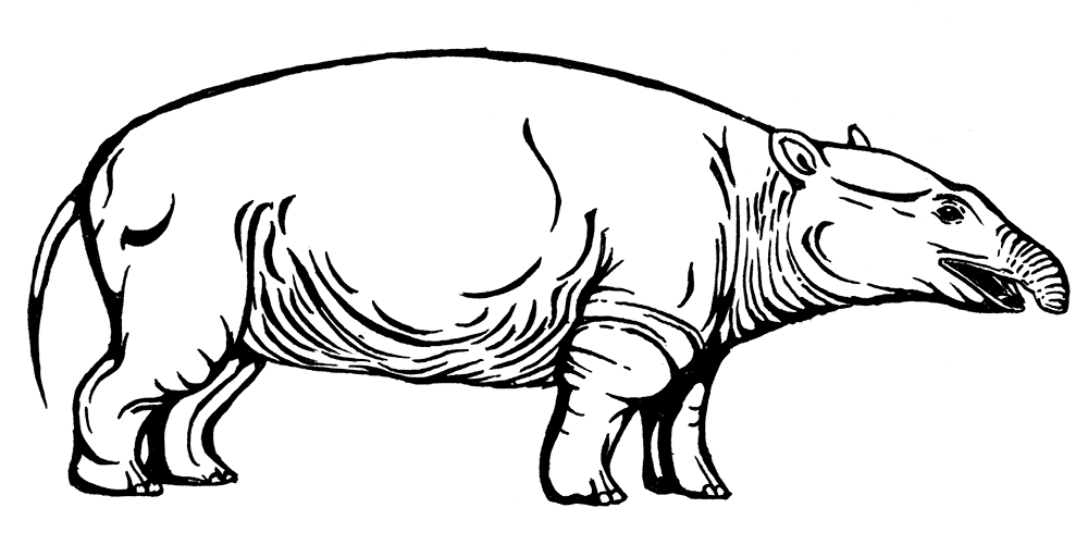Тапироподобны были и первые носороги – Yimengia, Triplopus, Hyrachyus, Lophiodon, Amynodon, Metamynodon и прочие, относящиеся к нескольким архаичным семействам. Многие из этих родов имели крайне широкое распространение – в Северной Америке, Европе и Азии. Amynodon известен также из Японии, а Hyrachyus – даже на Ямайке! Большинство из них были приземистыми бочкообразными коротконогими жителями болот и прибрежных зарослей и питались ветками и листьями кустарников. В отличие от тапиров, носороги сделали ставку на режущие свойства зубов, высококоронковость, большие размеры тела и, как это ни противоречит предыдущему пункту, – на способности к бегу. У некоторых архаичных носорогов сохранялись нормальные резцы и довольно большие клыки; на ногах часто по-прежнему было четыре пальца спереди и три – сзади; степные лошадеподобные Hyracodon и предки индрикотериев Forstercooperia уже сократили число пальцев на кисти до трёх. Между прочим, китайские среднеэоценовые индрикотерии Juxia приобрели свой классический облик, только размером были скромнее своих знаменитых олигоценовых потомков. Судя по отступанию носовых костей назад, у продвинутых Cadurcodon имелся небольшой хобот; эти болотные животные максимально походили на тапиров, да к тому же с большими вертикальными бивнями. Вот чего не было у первых носорогов, так это рогов! Не было их даже у первых настоящих носорогов семейства Rhinocerotidae – среднеэоценовых североамериканских Uintaceras radinscyi.