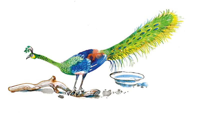 Неверно думать, что это синий павлин, только перекрашенный. Нет! Не только. Зелёный мощнее. Грудь у него шире, лапы крепче и шея выше. Гордая у него шея, а на ней сидит голова гордая и хохол на ней гордый. Не такой, как у синего – ровный и аккуратный. А набекрень хохол. Залихватский. Поглядишь на такой хохол и не пойдешь к павлину в клетку, даже на гордые шею, грудь и ноги смотреть не станешь.