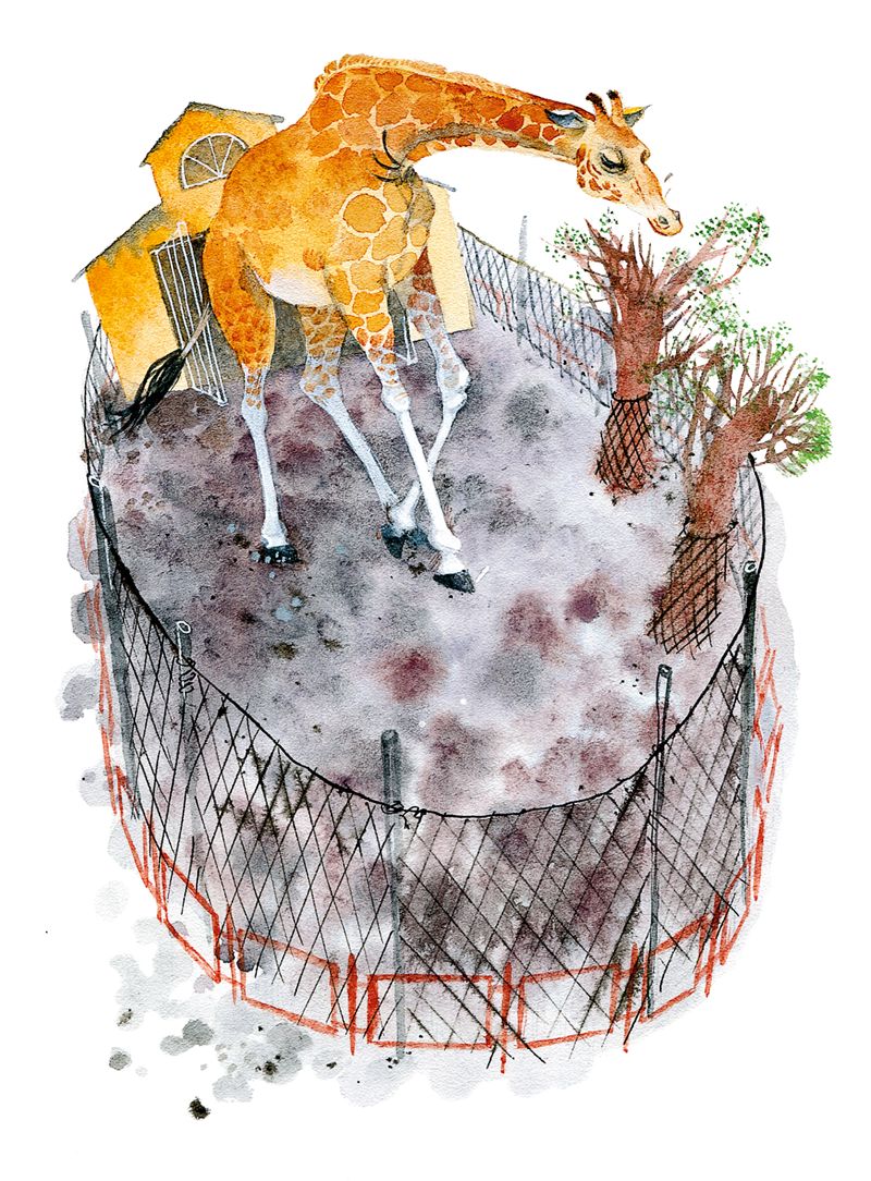 Перевели его бывших соседей – жирафов – на новое просторное место, а оранжевый Самсон так и живёт одетый в свой оранжевый дом, как в пальто. И каждый раз, выходя на прогулку, кланяется. Шея-то у него вон какая! Поневоле кланяться начнёшь!