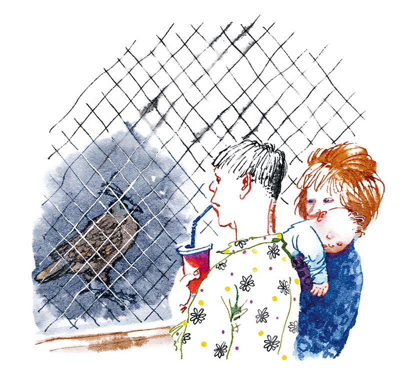 А ещё есть у нас зелёный павлин, он Зину очень любит за её рост и с ней драться всё время хочет, постоянно высматривает: