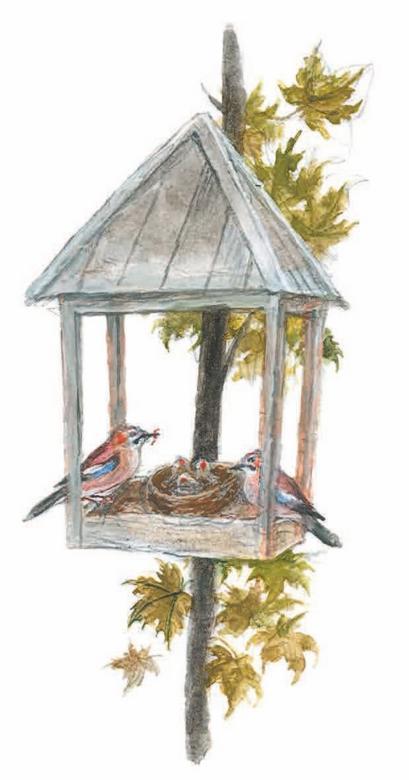 Вечером пошёл дед за дровами и увидел новых гостей – на поленнице появилось гнездо осторожных чёрных дроздов. А на другой день в просторную кормушку на клёне заселились сойки.
