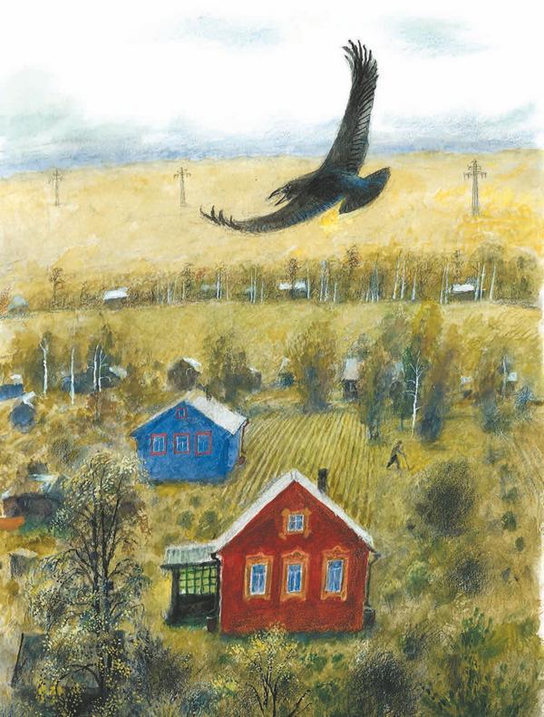 Но пока над деревней летает ворон, воробьи молчат. А когда скрывается он за дальним полем, в деревню начинают возвращаться привычные звуки. Старухи выходят из домов и опасливо смотрят в небо. А дед Иван кладёт на верстак недоделанную, понятную только ему штуковину и идёт пить чай.