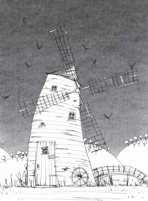 Yes, there it stood, silhouetted against the starry velvet night. Perhaps it had once been a jolly sight, pointing towards the sky like a lovely wooden ice cream as children and tulips danced around it doing their games. But no longer. Its red paint was peeling and faded. The wooden boards had rotted away in places, leaving dark gaping holes where I bet you anything there were rats. And the whole thing leaned lopsidedly towards the river, as if beckoning Polly to come closer. But Polly didn’t want to come closer. The more she stared at the windmill the less she liked it.