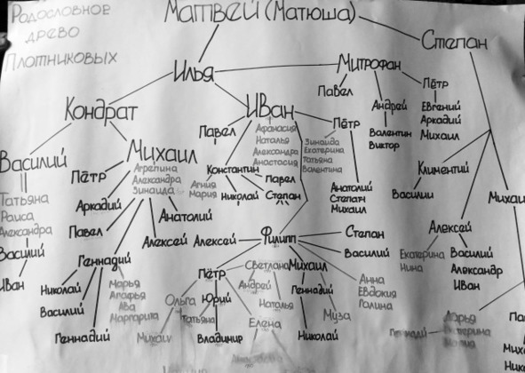 Некоторые веточки семейного древа состояли из семи-восьми колен. И вот с помощью сестёр Татьяны Плотниковой и Татьяны Нохриной я решила заняться историей рода, историей своей деревни. К этому времени у меня был в «запаснике» рассказ отца.