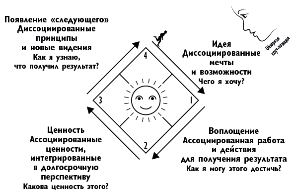 Давайте рассмотрим природу крупного многостороннего бизнес-проекта. Чтобы предпринять какие-либо действия, нужно задействовать все аспекты нашего обучения. Эффективное развитие проекта должно быть значительно глубже поверхностной идеи. Нам нужно представить все аспекты исполнения работы. Мы переходим от диссоциированного видения к ассоциированному получению результата, а затем – к ассоциированным ценностям; мы должны пережить яркий опыт ценности нашей работы и продолжить ее. И только тогда мы можем перенести этот опыт в действия и вернуться к диссоциированному обзору, чтобы определить самое значимое и самое полезное. Так мы формируем принципы для следующего приключения. Эти четыре шага позволяют перевести все жизненные проекты на «следующий уровень» и создать еще более ценные мечты для «следующего раза».