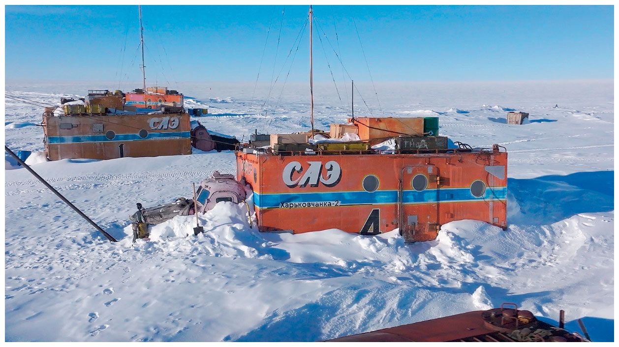 На спутниковых снимках станция Восток напоминает припорошенные снегом археологические раскопки: крохотные постройки раскиданы по снегу, как будто кто-то разбросал игральные кубики. На площадке размером примерно 150 на 150 метров размещаются вышки буровых, купол-палатка, которая скрывает спуск в старую буровую станцию, гараж, вытянутая дизельная электростанция, памятник погибшему на Востоке полярнику Алексею Карпенко, домик аэрологии с шаром-антенной. Тягач, прибывший сюда в 1950-х – память о первых полярниках, – и цепочка старых вездеходов.