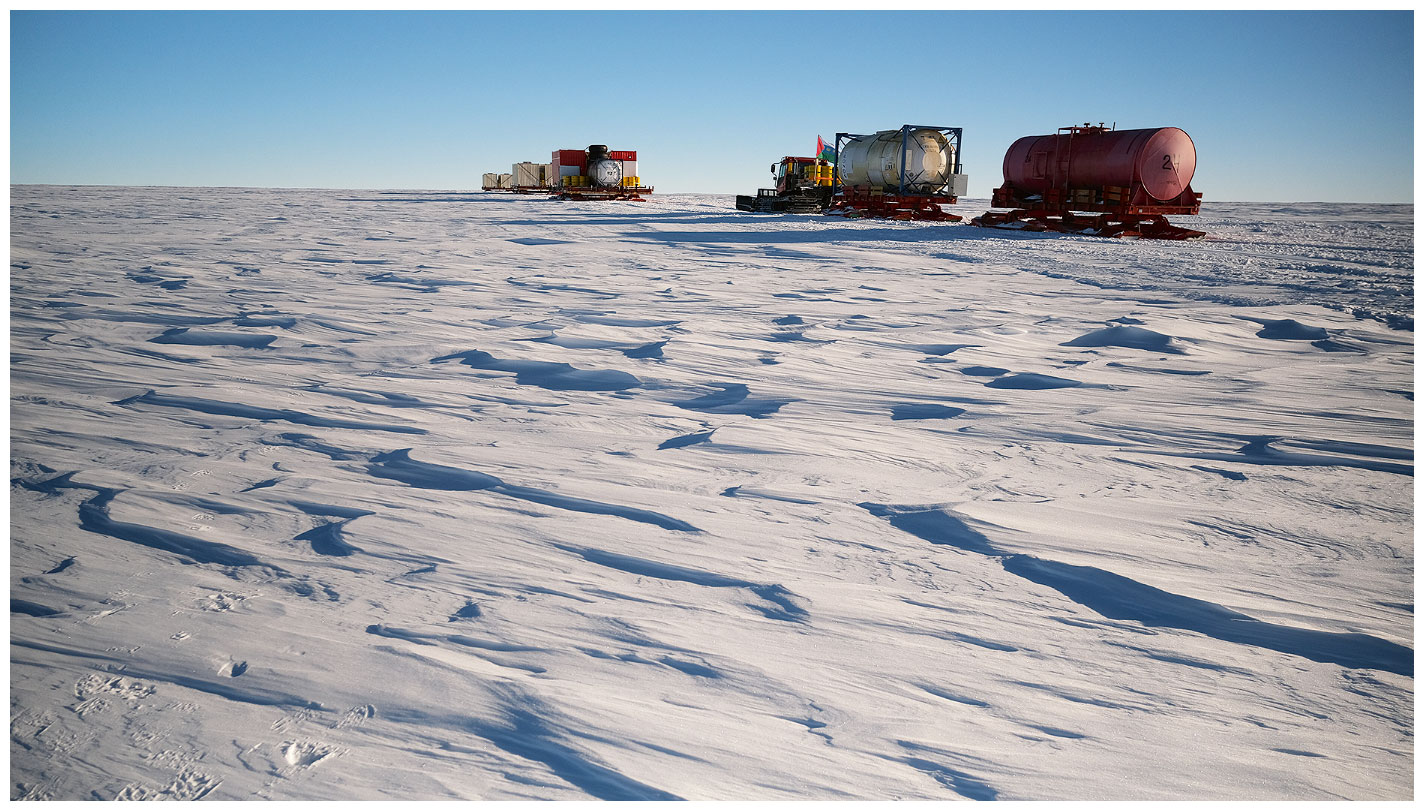 Санно-гусеничный поезд – основной вид грузового транспорта в Центральной Антарктиде. Обычно караван состоит из нескольких тягачей, везущих на санях полезный груз и емкости с топливом. Чтобы тягачи не сбились с курса, на них устанавливают радиотехническое и навигационное оборудование.