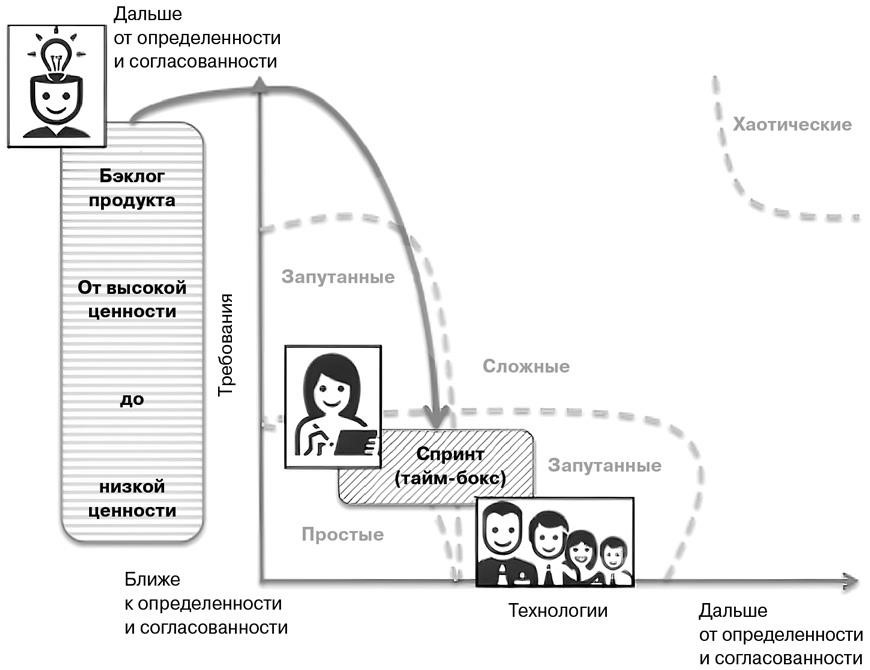 Вот как выглядит эта формула сегодня: у потребителей каждую минуту меняются потребности и желания, разработчики постоянно создают новые технологии и улучшенные версии старых, а потребители и другие стейкхолдеры никогда не упускают возможности высказать свое мнение по поводу свойств существующих продуктов. В процессе реализации проекта происходит эволюция нового знания, потребностей и желаний в отношении требований и технологий, и эта эмерджентность вносит свой вклад в сложность системы: у нее появляются новые свойства, не присущие ее элементам. Сложными проектами невозможно адекватно управлять при традиционных подходах, когда каждая задача ставится заранее и затем передается конкретным работникам. Если неизвестно, к чему нужно прийти в итоге, лучше всего воспользоваться подходами, основанными на эмпирических процессах или процессах с прочной доказательной базой: см. статью Д. Дж. Сноудена и М. Э. Бун «Модель действий лидера при принятии решений» (A Leader's Framework for Decision Making) для журнала Harvard Business Review. Но вопрос не в том, чтобы просто применить к той или иной ситуации правильный инструмент: сложные системы включают в себя и сложные взаимодействия между людьми. Сложному проекту нужен процесс, который учитывал бы эмерджентность. Кроме того, он требует и особого стиля руководства, способствующего развитию нормальных взаимоотношений в коллективе.
