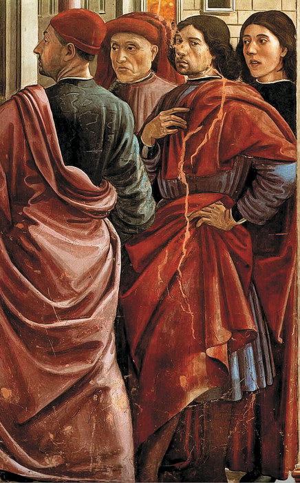 Д. Гирландайо. Изгнание Иоакима из Храма. Фрагмент росписи капеллы Торнабуони в церкви Санта-Мария-Новелла, Флоренция. Портрет семьи Гирландайо – Давида, Доменико, их отца Томмазо (между ними) и шурина Бастиано Майнарди (справа).