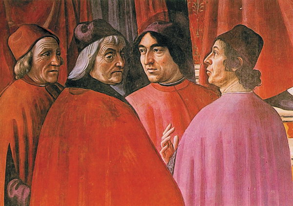 Д. Гирландайо. Благовестие Захарии. 1486–1490 гг. Фрагмент росписи капеллы Торнабуони в церкви Санта-Мария-Новелла, изображающий членов Платоновской академии Марсилио Фичино, Кристофоро Ландино, Анджело Полициано и Джентиле де Бекки.