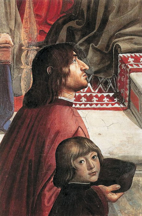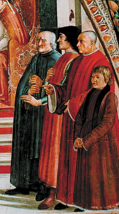 Д. Гирландайо. Утверждение устава францисканского ордена папой Гонорием III. 1482–1485 гг. Фрагмент росписи капеллы Сассетти в церкви Санта-Тринита, Флоренция. Портрет Полициано и его воспитанника Джулиано Медичи.