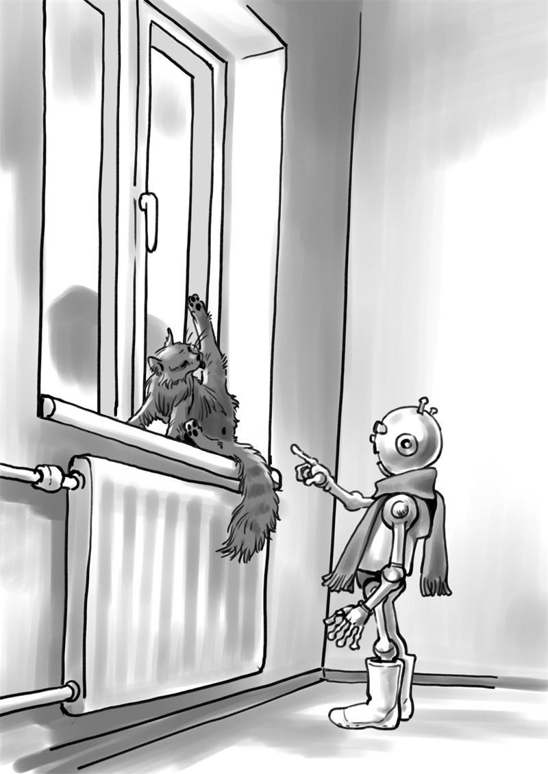 Робот стоял возле широкого подоконника и с подозрением смотрел на пушистый, рыжий комок шерсти на нём.