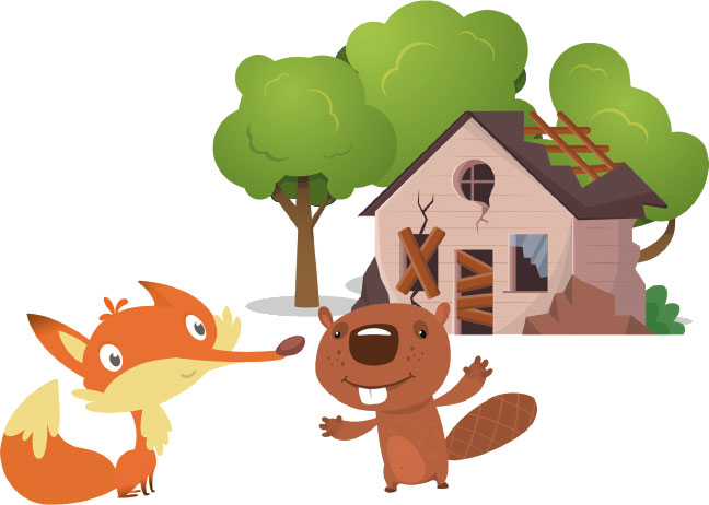 После того как экскурсия по хатке закончилась, пригласил Бобёр Лиса за стол. Только друзья сели кушать, как за окном ветер сильный поднялся. Тут хатка-то и заскрипела. Испугался Лис, но Бобёр его и успокаивает: