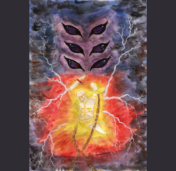 Он не видел того, что было у него за спиной, но чувствовал это всем своим существом. Чувствовал холодный чёрный дым, медленно обволакивающий его, пристальный взгляд шести огромных глаз и… цепи. Цепи на руках, ногах, на шее. Они не давали пошевельнуться. Чёрный дым обжигал холодом, забирал силы, а цепи всё сильнее сдавливали, сковывали движения.