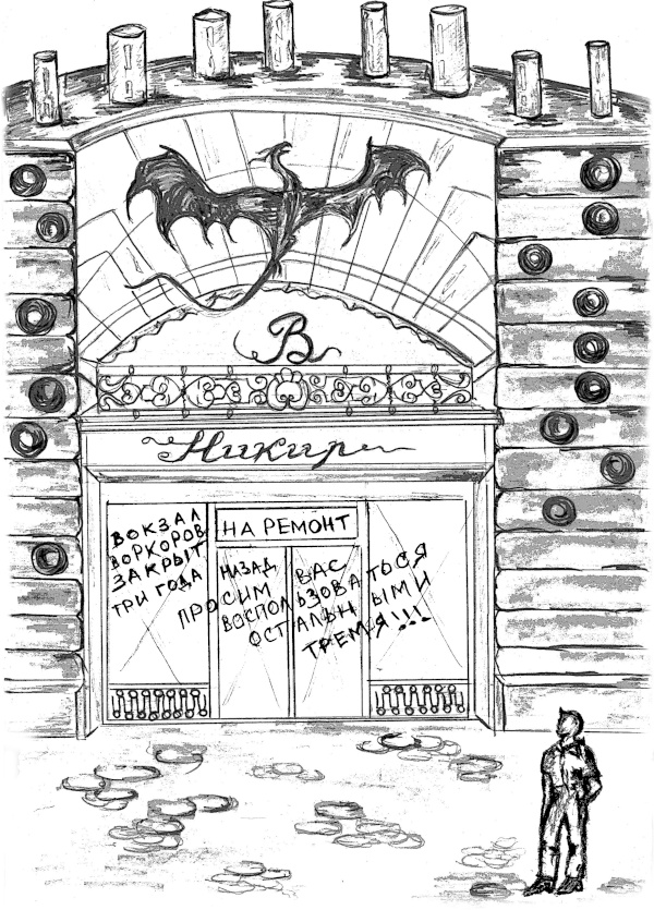 Вот вокзал воркоров, круглый и с множеством труб. Только не было вокруг него привычной суеты. Не летали драконы и летающие такси, не входили и не выходили капсулы воркоров. Чем ближе он подходил к Восточному вокзалу, тем безлюднее становилось вокруг. Что-то тут явно было не так. Наинекс, поглощённый отчаянием, не замечал этого. Он шел к вокзалу всё быстрее и быстрее, решив отправиться куда «глаза глядят», подальше от этого города. Вот уже и прозрачные двери вокзала… Вот только они какие-то пыльные и уже совсем не прозрачные, да и дорожка перед ними вся заросла …Наинекс с недоумением посмотрел на двери – над ними висела большая табличка, на которой кто-то неаккуратно написал красной краской: