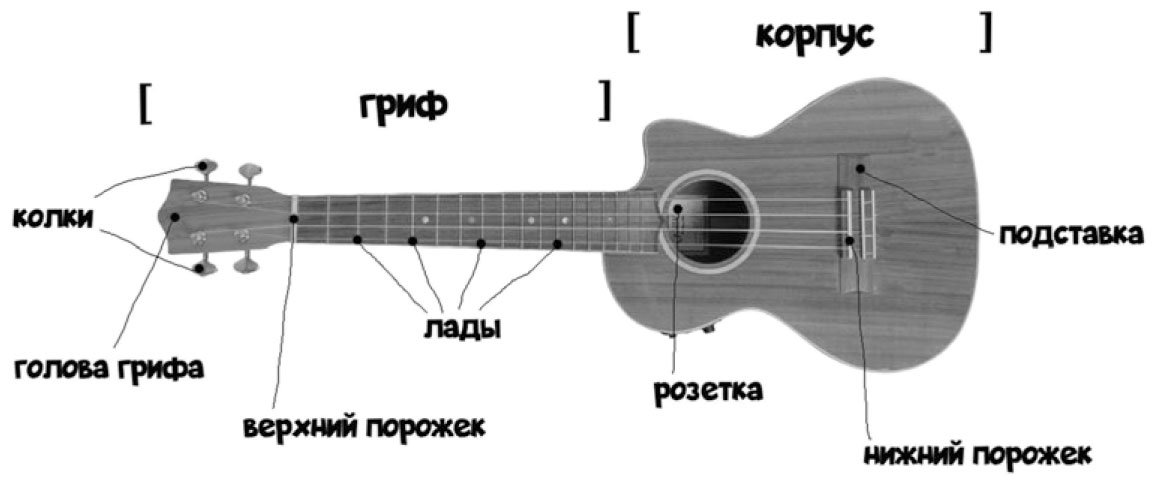 Как в школе на уроках биологии мы изучали строение человека, так и сейчас нам нужно выяснить, из чего же состоит укулеле. Далее в книге я буду использовать термины из этой главы, поэтому настоятельно рекомендую все их выучить. Скорее всего, вы все это уже знаете, но на всякий пожарный случай советую повторить.