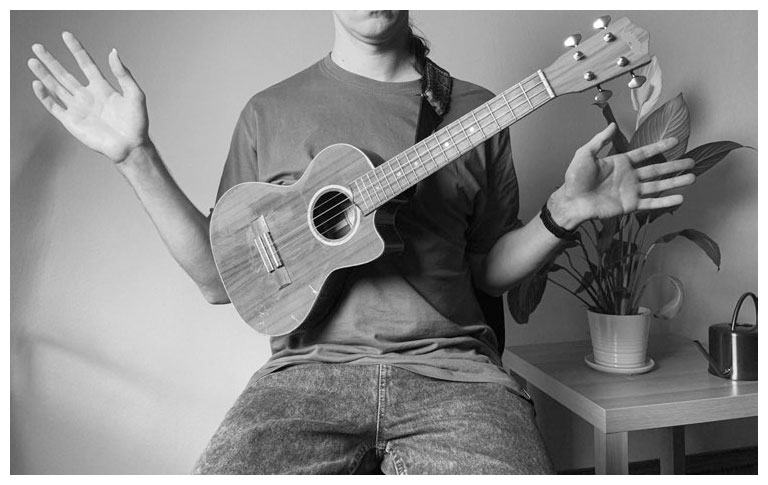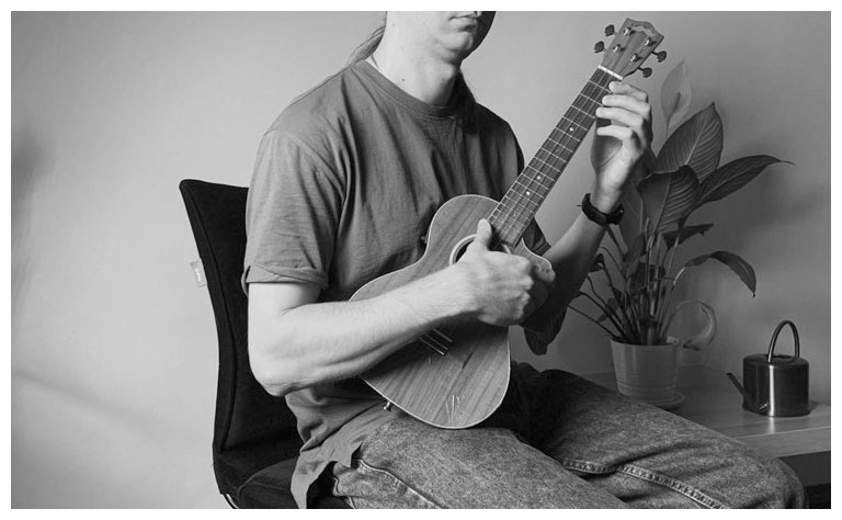 Наверняка вы видели в интернете, как разные исполнители играют стоя вообще без ремня. Да, так бывает, но я настоятельно рекомендую играть сидя. Да, гравитация тянет нас вниз, но поддерживать укулеле правой или левой рукой – это усилие, которое формирует зажим, что в нашем случае не очень хорошо.
