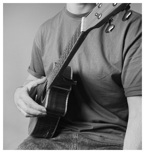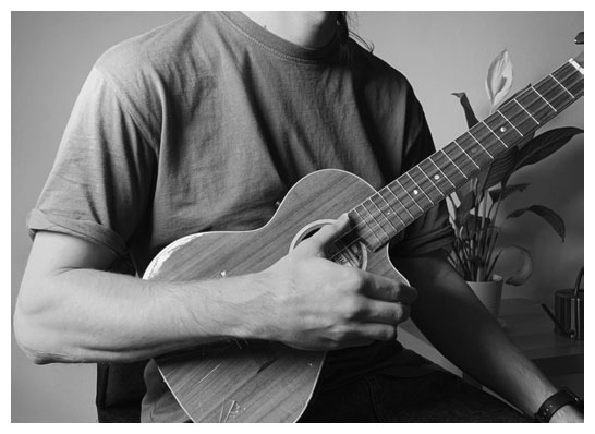 С постановкой рук все существенно проще. Начнем с правой руки. В рамках данной книги мы будем играть только одним пальцем правой руки – большим, все остальные пальцы будут лишь слегка поддерживать укулеле снизу, где начинается боковая часть корпуса.