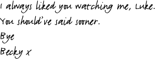 The two weeks we were away I thought about her every day. Yorkshire was so boring. Dad and Uncle Chris fixing old bikes. Marc cooking with Mum. There was nothing to do but walk in the wet fields and think about Becky. Her face as she opened the letter. Her writing one back. Me running alongside her as she rode her BMX to the park.