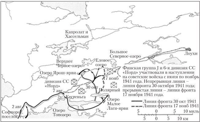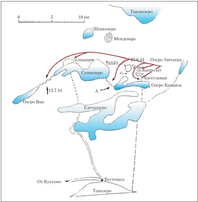 «Их план был совершенно очевиден. Он состоял в том, чтобы окружить основными силами северный фланг немецко-финских войск, пробиться к косе между озерами Пяозеро и Топозеро и отрезать армейский корпус, для которого дорога через косу из Кестеньги в Куусамо была единственной связующей линией и путем отступления. Это наступление готовилось долгое время, а поскольку оно должно было происходить на заболоченной территории вдали от дорог, они задействовали крупные силы – по крайней мере, целую дивизию или даже две.