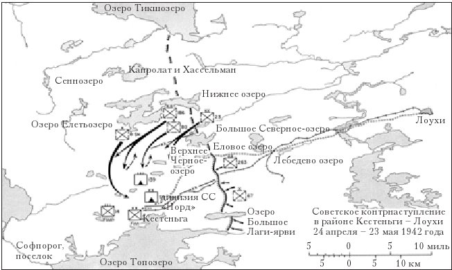 Русское контрнаступление 24 апреля – 23 мая 1942 года. Карта основывается на материалах из книги Эрла Зимке «Немецкая оккупация Северной Европы. 1940–1945» Рис. Л. Бута. Названия Капролат и Хассельман вписаны, текст на карте изменен. Русские наступали в северо-западном направлении с целью отрезать немцев и финнов и занять штаб в Кестеньге. Они применили ту же тактику, что во время последнего наступления в июне 1944 года