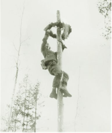 Норвежский фронтовой боец достает «приз» с вершины майского шеста на Капролате. Это венок, на котором висят маленькие бутылочки с аквавитом