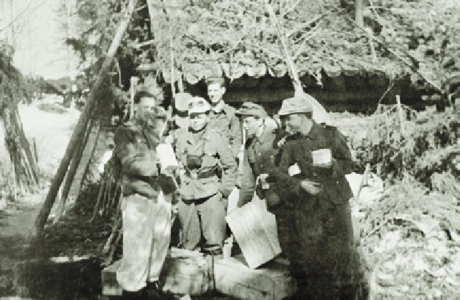 Распределение товаров маркитанток перед бункером на высоте Капролат, или «высоте 200». Маркитантские товары доставлялись на фронт вместе с письмами и посылками из дома. Там были шоколад, маленькие бутылочки со спиртным, консервы, сардины. Вольфганг Виндингстад полагает, что второй солдат слева в светлой кепке и солнечных очках, возможно, Сигмунд Вигеруст. Его называли «толстяк». Альтернативная подпись к данной фотографии гласит: «Лыжный егерский батальон на высоте Капролат в 1944 г. Бойцы изучают пришедшие посылки. В центре в кепке и в очках – Пер Винье из Осло, дата рождения 12.09.1924, записался в лыжную роту 01.09.1942. Состоял в 1943 году в Полку Норвегия, а потом в Лыжном егерском батальоне» (фото из архива Улы Сэли)