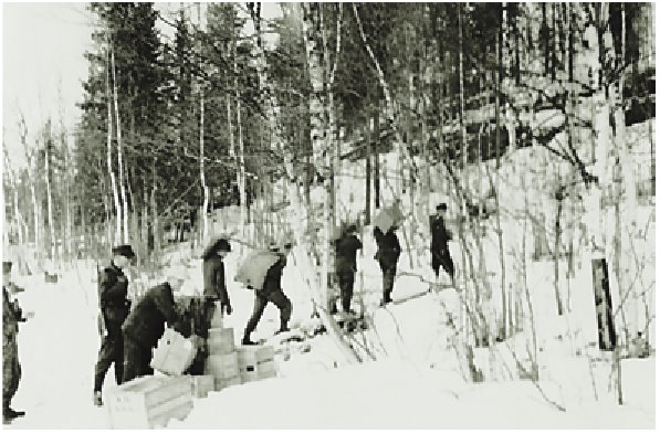 Провизия и снабжение поступали в зимнее время через Сапожное озеро. Груз вынимали из деревянных ящиков и несли на вершину Капролата. На фотографии изображен подъем на высоту около 150 м. Грузы доставлялось также по равнине около позиции Визель II (фотография из Норгес Лекси – архива норвежских политических документов в Интернете)