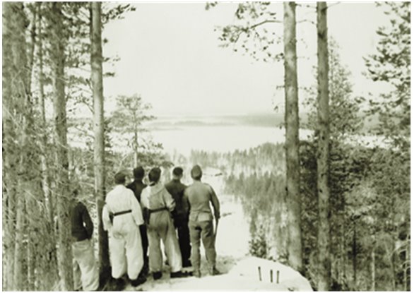 Двое солдат идут от основной оборонительной линии полосы к передовой позиции для смены караула. Слева виден один из пулеметных бункеров (ДЗОТов), срубленный из крупных бревен. Над перекрытием пристроена еще одна легкая скатная крыша из жердей, а на ней – ветви и кусты в качестве камуфляжа. Это, возможно, «бункер Стормуен» (фото из архива Улы Сэли)
