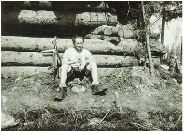 Арнльот Винье перед ДЗОТом (деревоземляная огневая точка) (номер 2 на рисунке) с автоматом Шмайсер. Справа на расстоянии около 70 м видна передовая позиция (фото из архива Гейра Брендена)