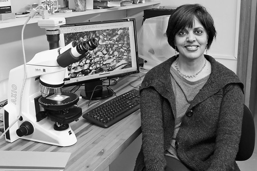 Анусуйя Чинсами-Туран изучает в лаборатории микрофотографии срезы костей.