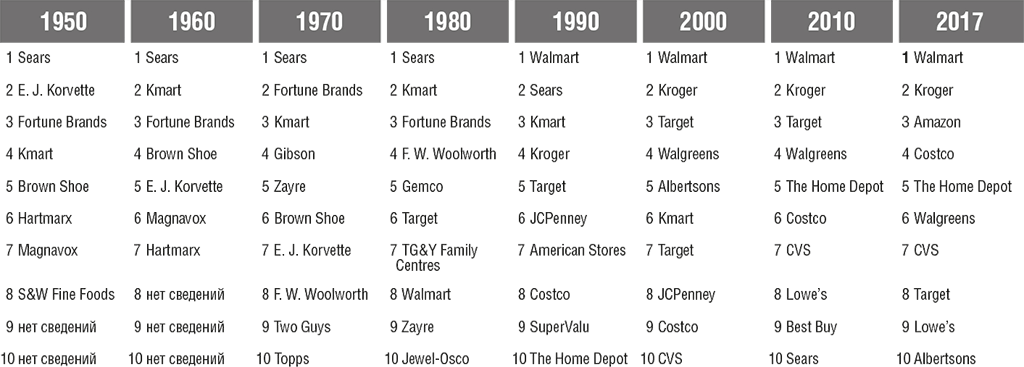 Взгляните на приведенные ниже рейтинги ведущих ритейлеров по десятилетиям – и сразу поймете, почему CEO компании Walmart Дуг Макмиллон держит скриншот этой таблицы в памяти своего телефона: она напоминает ему, как быстро может меняться положение ритейлеров на рынке.