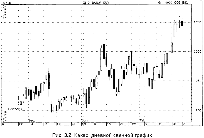 Различия между баровым и свечным графиками заметить нетрудно, хотя и тот, и другой содержат одинаковую информацию о ценах. При использовании свечей плоский, двухмерный баровый график как бы становится трехмерным: кажется, будто свечи пытаются покинуть пределы страницы, создавая стереоскопическую картину рынка. Сравните рисунки 3.1 и 3.2 – свечной график явно производит более яркое впечатление.
