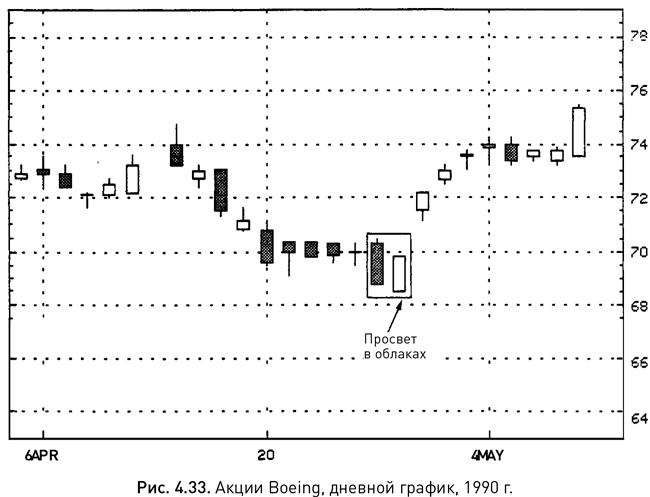 Длинная черная свеча на рисунке 4.33 означает, что 27 апреля медведям удалось продавить рынок до новых минимумов. На открытии следующих торгов цена опустилась еще ниже, но ненадолго. К закрытию торговой сессии на графике сформировалась белая свеча, поднявшаяся выше середины предыдущей черной. Таким образом, эти две свечи от 27 и 28 апреля образовали бычий просвет в облаках.