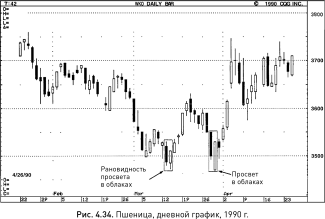 На рисунке 4.34 показан классический просвет в облаках, появившийся на графике в конце марта. После свечи с длинным черным телом возникла очень сильная белая свеча со срезанными основанием и вершиной. Цена в этот день на открытии обновила минимум, а к концу торгов поднялась до максимальных отметок, и в итоге белая свеча перекрыла черную больше чем наполовину. Игроки на понижение потеряли контроль над рынком, и падение цен, начавшееся с медвежьей модели поглощения от 19 и 20 марта, остановилось.
