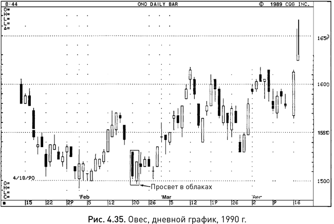 Рисунок 4.35 демонстрирует, как знание свечных моделей может помочь аналитику быстро оценить ситуацию на рынке. В конце февраля 1990 г. один брокер спросил меня, что я думаю о перспективах цен на овес. Я почти не слежу за этими ценами, но, взглянув на свечной график, представленный на данном рисунке, я предположил, что нисходящая тенденция, скорее всего, завершилась. Почему? Я заметил, что 20 и 21 февраля на графике сложилась почти классическая модель «просвет в облаках». Также я заметил, что формирование этой модели совпало с тестированием поддержки на уровне более ранних февральских минимумов – это повышало шансы на формирование двойного основания.