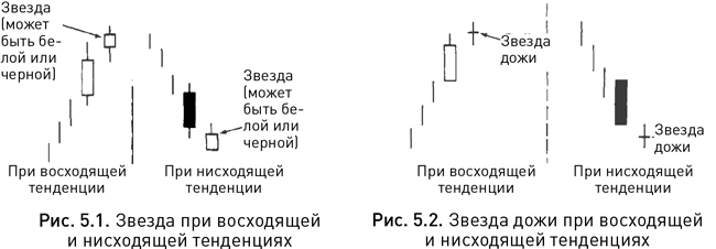 Появление звезды, особенно звезды дожи, предупреждает о возможном завершении предыдущего тренда. Так, если на бычьем рынке звезда возникает после длинной белой свечи, значит силы быков и медведей достигли некоего равновесия за счет ослабления позиций первых или усиления позиций вторых. Если же звезда образуется на медвежьем рынке, значит энергия, толкавшая цены вниз, ослабела, и падение вряд ли продолжится.