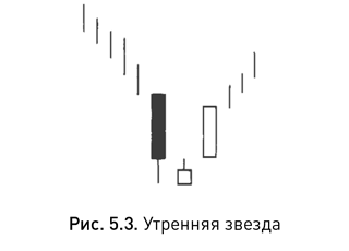 Как самая яркая звезда на утреннем небосклоне – планета Меркурий – предвещает восход солнца, так и модель утренняя звезда сигнализирует о грядущем повышении цен (см. рис. 5.3). Она является сигналом разворота в основании и состоит из свечи с длинным черным телом, за которой с гэпом вниз идет свеча с маленьким телом (эта комбинация представляет собой основную часть модели), а за ней – свеча с белым телом, перекрывающим значительную часть черного тела первого дня.
