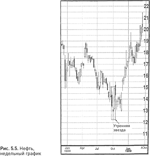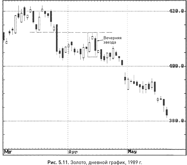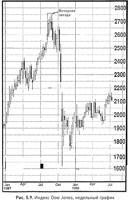 Вечерняя звезда на рисунке 5.9 возникла летом 1987 г., когда американский фондовый рынок достиг максимальных отметок, а затем обвалился. Интересно, заметили ли эту модель японские технические аналитики, которые, в отличие от западных, уже тогда прекрасно владели свечным анализом.