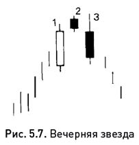 Вечерняя звезда является медвежьим двойником утренней, ее название напоминает нам о планете Венера – первой яркой звезде на вечернем небосклоне, предвещающей наступление темноты. Поскольку вечерняя звезда служит сигналом разворота на вершине, она формируется, как правило, после восходящего тренда. Первая свеча этой модели имеет длинное белое тело, вторая – короткое тело любого цвета, а третья – черное тело, перекрывающее значительную часть белого (см. рис. 5.7). Обычно я сравниваю вечернюю звезду с переключающимся светофором: сначала светит зеленый сигнал (это бычье белое тело первой свечи), затем загорается желтый (предупреждающий знак средней свечи), и, наконец, его сменяет красный (третье черное тело подтверждает окончание бычьего тренда).