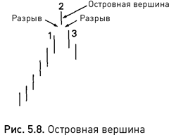 При первом взгляде на рисунок 5.7 можно подумать, что вечерняя звезда ничем не отличается от островной вершины – модели разворота в западном техническом анализе (см. рис. 5.8). Но при внимательном рассмотрении вы поймете, почему вечерняя звезда чаще предупреждает о прекращении тренда. У этой модели нижняя граница тела 2 должна находиться выше верхней границы тела 1 (то есть значение имеют цены открытия и закрытия рынка, а не минимумы и максимумы), в то время как у островной вершины минимальная цена второго дня должна превышать максимальные цены первого и третьего дней.